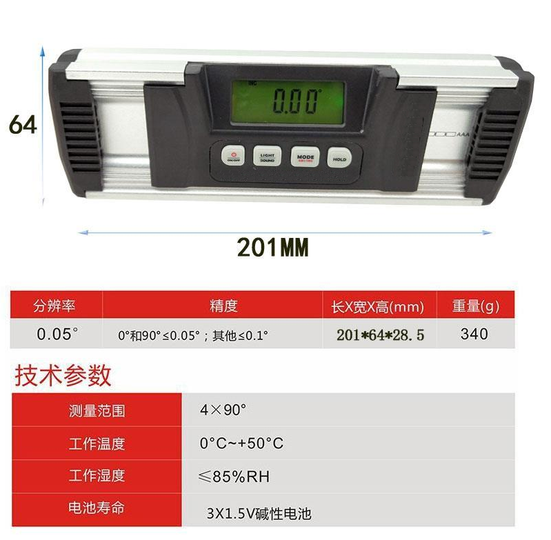 5、读数值:0.01°, 测量精度:0.1°