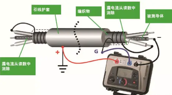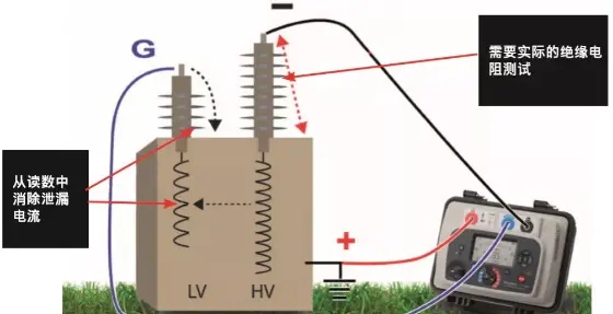 上图:在变压器绕组测试中,通常使用屏蔽接口来消除由于脏的磁绝缘子的表面通路而带来的泄漏电流。
