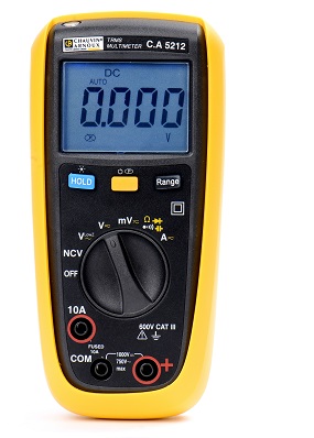 Ÿ CA5212是一款4000-计数、一类精确的真有效值(TRMS)万用表,可用于日常的各种电气设施的维护。该类型万用表具有标准万用表所有的功能,包括:电压(Vac,Vdc)、电流(Aac,Adc)、电阻(Ω)、电容(mF)的测量,通断性测试和二极管测试。